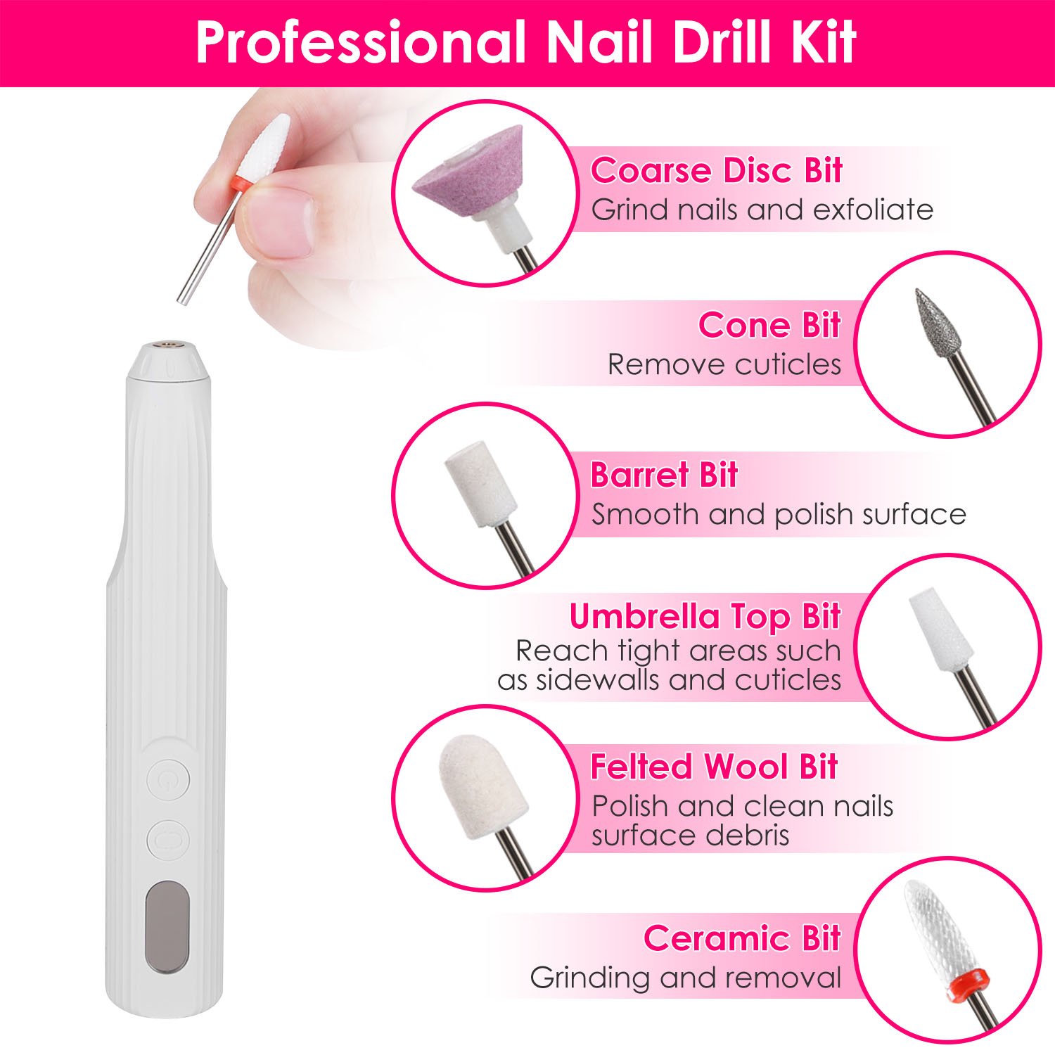 Our all-in-one professional nail drill kit includes 6 kinds of drill bits, which is suitable for grinding, carving, cutting, polishing for all nail arts as well as cuticle removal. With 5 adjustable speeds and F/R direction control, our electric nail drill enables precise and efficient nail artistry for both right-handed or left-handed user. Moreover, the charging base not only can recharge the electric nail drill, but also can be used as a drill bit storage case and UV nail dryer with timer setting. Functional, versatile and easy-to-use, it\'s an essential tool for nail-care professional person or beginners alike.